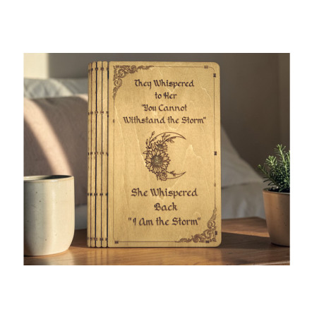 A beautifully hand crafted wooden book‑style box featuring an empowering engraved quote. Perfect for storing keepsakes while adding a touch of inspiration to any space.